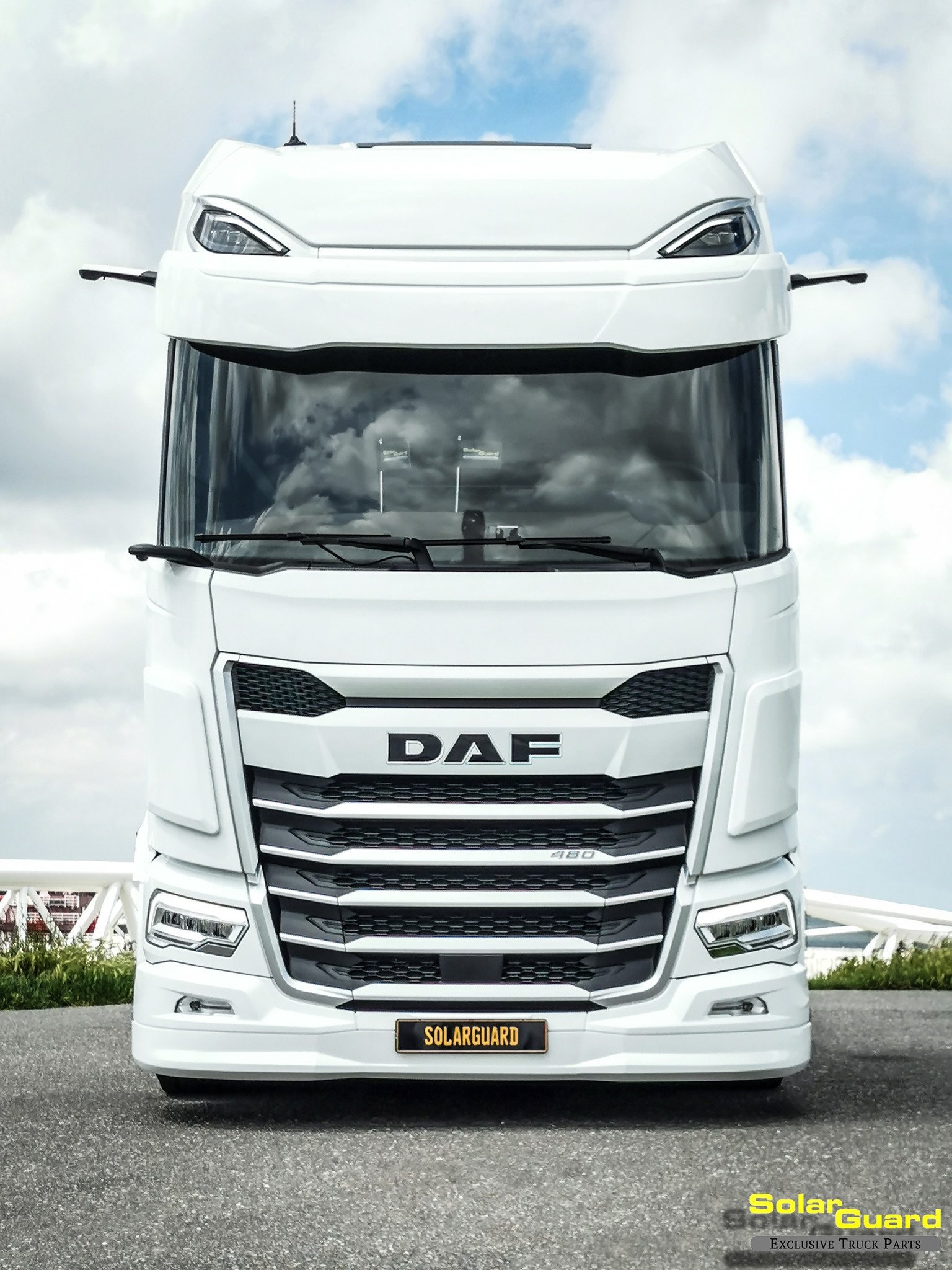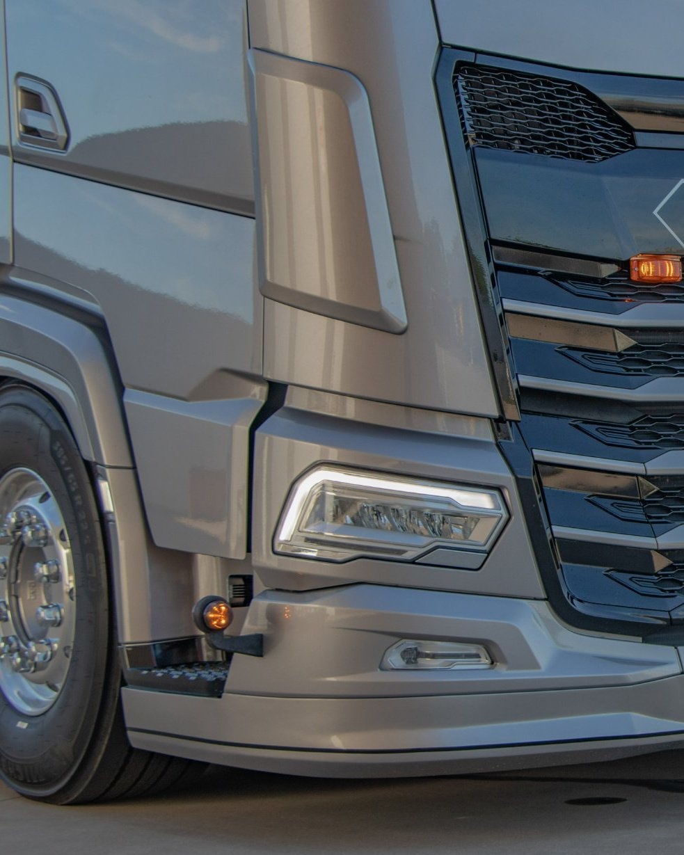 Solar Guard Exclusive Truck Parts fabrique des déflecteurs de boue pour les DAF Next Gen XF, XG et XG+. Ils donnent aux coins de la cabine un aspect plus robuste sans changements majeurs et suivent les lignes d'origine. L'ensemble s'adapte aux points de montage d'usine et est livré avec un kit de montage et des instructions claires. Ils canalisent la saleté, l'eau et la boue et aident à prévenir la rouille. Ils sont fournis en blanc DAF pour être peints ou recouverts.
